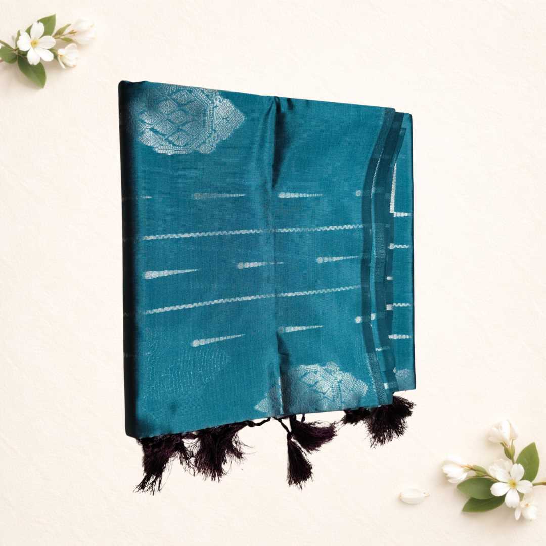 • Border less soft silk sarees with Contrast Pallu and tessels - Blue Green