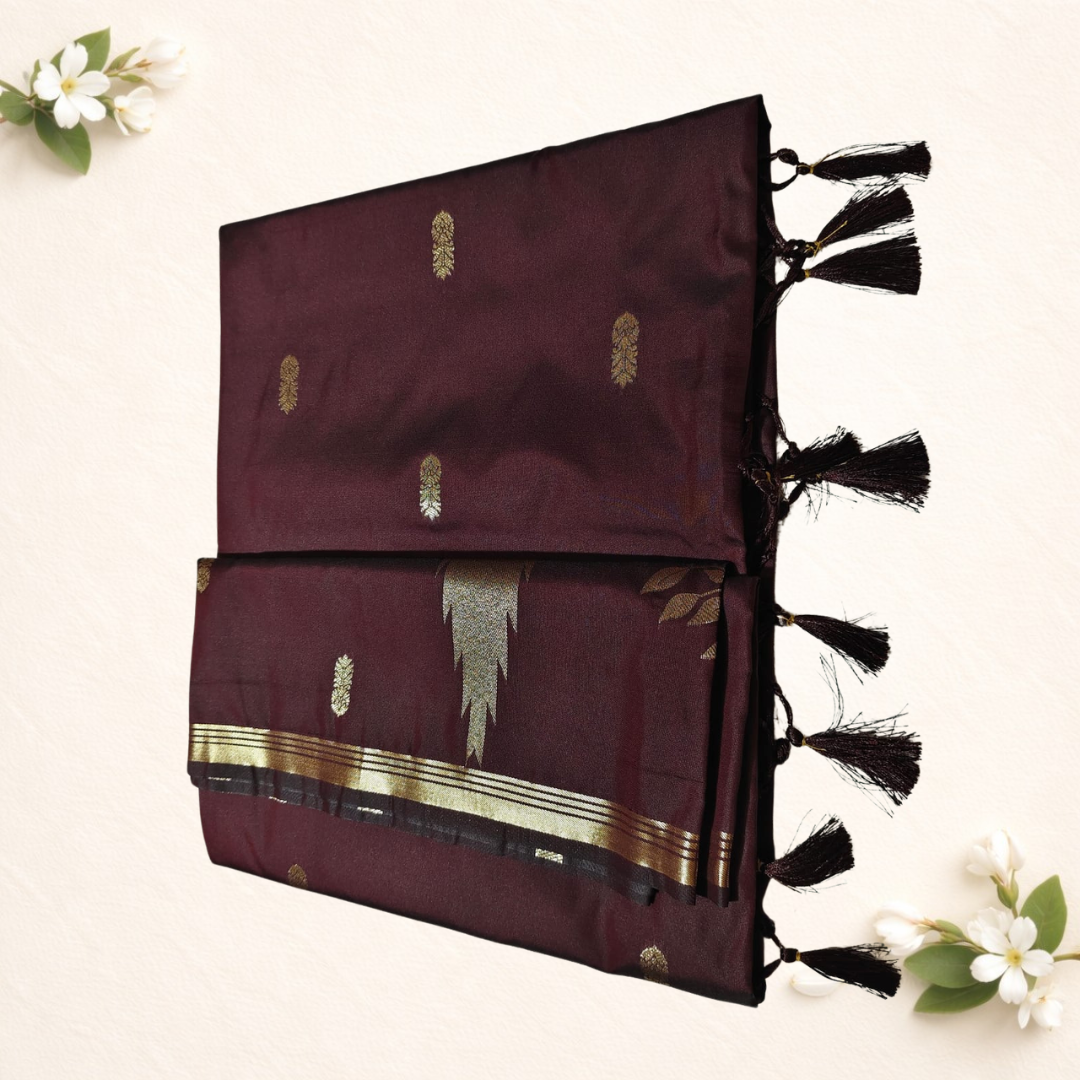 Synthetic sarees with big flower motives Contrast pallu and blouse Softy material Zari weaving with blouse and tessels